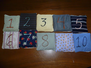 After cutting out all the squares, I applied numbers by using fabric paint. After these were dry I stitched the squares together with right sides in, leaving about an inch open on the end of one side so that I could turn it back right side out and insert a funnel and fill with the rice.