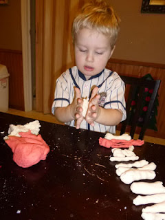 Here my son is making worms. This is before he announced he was going to play worm farm and stuck his play worms in my plants. Doh!