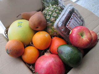 Grub Market and what exactly it is. It was new to me when I agreed to do this review and provide my readers with a giveaway. See that box full of fruits!!! They are all ORGANIC! When they arrived, they were either ready to eat or ripened in a few days. Included in this California Fruit Bounty Grub Box was a Pummelo, a Mandarin, a Blood Oranges, 2 Oranges, 3 Apples, a Pomegrante, an Avocado, a Pineapple, 2 Bosc Pears, and a container of Medjool Dates. This was the
