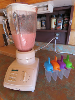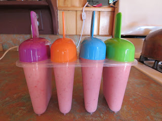 My strawberries had gotten a little soft, but were still good. So, popsicles (or smoothies) are a great way to use up the fruit that might not be prime for eating whole. The kids will never know and they all seem to just love popsicles and smoothies.
